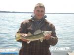 The presentation that has continued to put fish in my boat has been pulling lindy rig's on the sand breaks. Many of these sand breaks are still holding small males that are in their post spawn mode. We have varied the length of our snells from as short as 6ft on up to as long as 12ft. Going to the shorter length when in some of the random rocky areas along the NE corner on the lake. Red hooks have been the only color working for me so far...medium to large size leeches are also the ones to pick out of the bucket! Its not time to go too big yet as for the size of the leech. The best depth has been from as shallow as 8 ft out to as deep as 17 fow. Some fish are holding close to the sharper breaklines along the northern sections of the lake. I'm still catching small males milking all over the boat....... trolling speeds have also been important with maitaining a drift or trolling speed of .5 or less. Don't try to cover to much area at high speeds! slower is better!