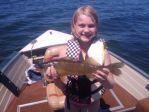 My family and I weren't able to make it up to the lake until Monday. We decided to wait to go out until Tuesday because of the wind and rain. The 2 girls and I hit the water about noon and went out to the flats to try our luck with bobbers. By 3:30, we had went through our 2 dozen leeches. Of course there were a lot of misses (the girls still have a little work to do setting the hook), but all-in-all we boated 18 with 3 going in the box. Emelia, 7, had the biggest at 26". It was great, Claire was holding half of the rod while Emelia was realing it in. Claire, 9, had the biggest keeper at 17 3/4". If you've caught any fish in the 17-18" range you can appreciate the size of these fish. I don't have a scale, but I swear that thing had to be pushing 2 1/2# easy.