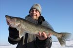 Is it January or March? With the weather and the numbers of jumbo perch, this weekend felt more like late season ice fishing. On Friday afternoon we headed up to the North end and found a lot of other anglers with the same idea. We kept on the move and picked up a nice mixed bag of walleyes and perch in 25-28 feet. Most of the ice in the area was 12-13" but we did find some that was only 10". On Saturday we carefully ventured out from the East side on snowmobile and ATVs. We found a large crack running North and South just East of 2 mile reef. There were some areas that were crossable on foot, but it isn't worth the risk with shifting ice conditions. We were able to fish some of the rock piles around Lakeside Reef and South. We did connect with some nice walleyes ranging from 21-26 inches. The ice was 10-12" in that area. In the afternoon we went back up North and found another nice mixed bag of fish. There were quite a few lookers on Saturday compared to the aggressive fish we found on Friday. Sunday was another nice day on the water. We fished a new area along the North end in 28-29 feet and found the same steady action with mainly walleyes. Over the deeper water we had varying ice depths of 8-12 inches. We caught many different year classes of walleyes ranging from 5-27 inches and perch from 3-13 inches. There are still large areas of open water and thin ice all along the East and North end.